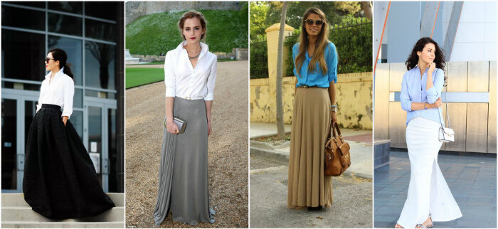 В зависимости от длины рубашки, кроя юбки и пропорций конкретной фигуры, можно заправить рубашку внутрь, завязать узлом на талии или выбрать вариант навыпуск, под пояс. К такому наряду подойдут различные аксессуары, можно выбрать любой: брошь, шейный платок, колье. Обратите внимание на модные и необычные фасоны рубашек (с асимметрией, втачным поясом, пуговицами сзади, интересными деталями). Настроение образа выбираем в зависимости от ситуации: он может быть строгим, вечерним, повседневным, женственным, спортивным.