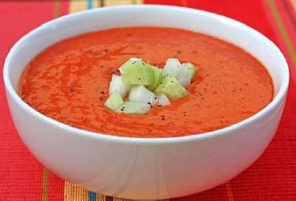 Ингредиенты: 1 килограмм помидор; 2 красных болгарских перца; 1 огурец; 2 зубчика чеснока; 1 острый красный перчик; 1 лимон; 1 батон белого хлеба; 3-4 капли соуса табаско; пучок тимьяна небольшой; 1 столовая лодка оливкового масла; 1 стакан кубиков льда; красный винный уксус; соль (по вкусу) Начинаем готовить Овощи и зелень тщательно вымыть и обсушить. Берем помидоры, обдаем их кипятком и опускаем на несколько минут в ледяную воду, затем снимаем кожицу, разрезаем пополам и убираем семена. Перцы разрезаем пополам и удаляем сердцевину. С огурца срезаем кожуру. Нарезаем овощи небольшими кубиками. Очищаем и измельчаем чеснок. Срезаем корку с хлеба, а мякоть нарезать кубиками. Сложить наши помидорки, перцы, огурец, чеснок и хлеб в одну большую чашку. Веточки тимьяна раздавить обратной стороной ножа и добавить к овощам. Посолить(на ваш вкус). Далее берём кубики льда и измельчаем их. Высыпаем их к овощам. оставляем на 10-15 минут, пока не растает лед. В полученный суп добавляем уксус, 2-3 кап