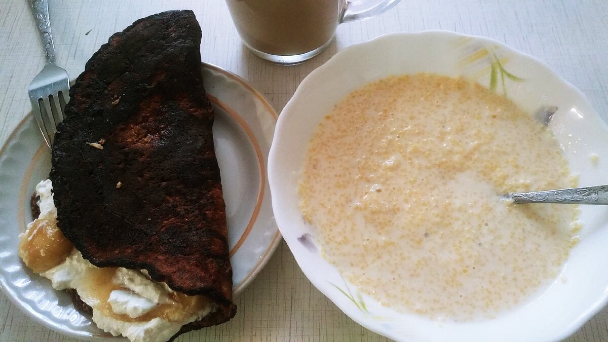 Он приготовил кус-кус с яблоком и овсяно-блины с остатками творога и бананом. На фото блины не горелые, муж добавил в тесто какао.