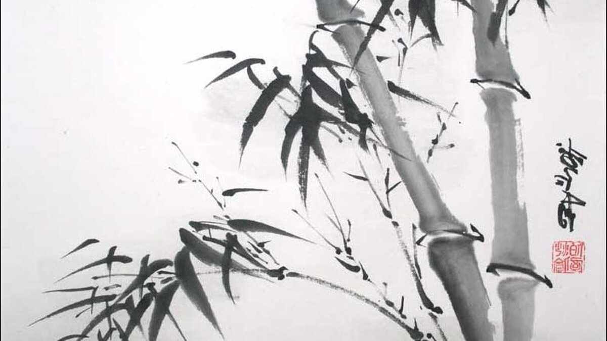 Смочите кистью всю поверхность на бумаге - мы называем ее поэтически спящей. Слеза пятна . Когда вы тянете уложенную щетку в направлении вала, вы получаете линию разной длины , которую вы можете использовать, например, как лист травы. Выравнивание ворса щетки под разными углами перпендикулярно направлению хода позволяет создавать разные области затенения . Такое боковое натяжение кисти используется, например, для окрашивания бамбуковых стеблей. Попробуйте потянуть за локоть и плечо, подняв или подняв руку.