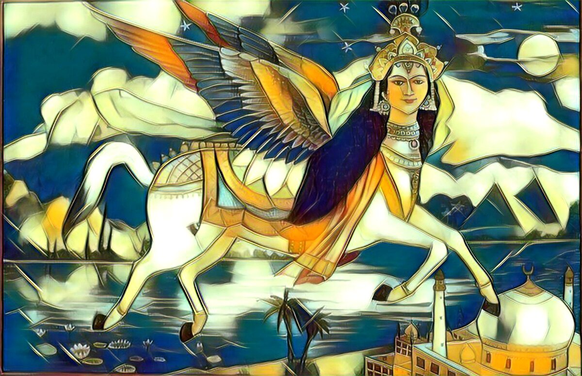 Бурак , в исламской традиции, существо которое, как говорят, перенесло пророка Мухаммеда на небеса . Описывается оно как "белое животное, мул или лошадь, с крыльями по бокам." Бурак был первоначально упомянут в истории ночного путешествия Мухаммеда (исрах ) из Мекки в Иерусалим и обратно, объясняя, таким образом, как путешествие между городами могло быть совершено за одну ночь. В некоторых традициях он стал конем с головой женщины и хвостом павлина. Когда рассказ о ночном путешествии ( исрах ) стал связан с рассказом о вознесении Мухаммеда на небеса ( ми Шрадж ), Бурак сменил лестницу как средство вознесения Мухаммеда на небеса. По крайней мере, с 14-го века миф о Бураке , составленный на основе древних изображений грифонов, сфинксов и кентавров, стал любимым предметом персидской миниатюрной живописи .