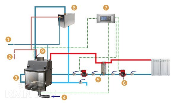 В некоторых печах циркуляционные насосы устанавливаются не только для воды, но и для воздуха. Это понятие чисто опционально, вентилятор наддува используется лишь как способ быстрее обогреть помещение до комфортной температуры.