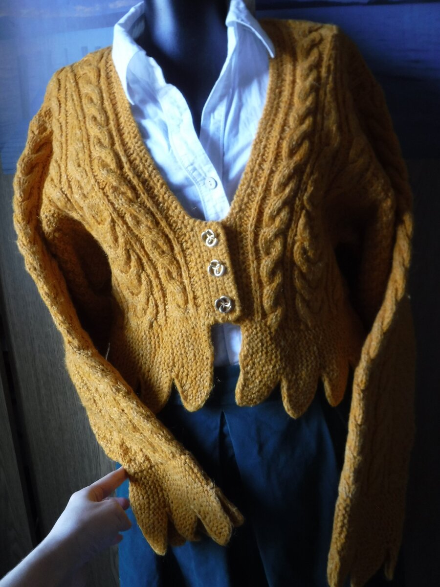 А самым большим разочарованием были даже не несоответствие цвета и не отсутствие аксессуаров с картинки. Нити давали плотное толстое полотно, это было хорошо, но для модели с рукавом типа летучая мышь - жуткая жесть. Тяжело и оттопыренно не к месту... Особенно на юношеском отсутствии груди.