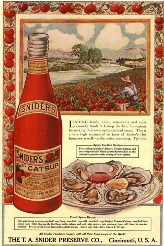 Кетчуп появился в Европе в конце XVII века. Британцы столкнулись с этим соусом в Юго-Восточной Азии и прониклись. А потом честно пытались повторить прекрасное дома с разной степенью успешности. Тот оригинальный кетчуп, который они попробовали, был темным, почти черным, соусом и изготавливался из ферментированной рыбы. Да-да, наш томатный приятель - явный родственник вьетнамского рыбного соуса, не удивляйтесь. В европейских рецептах кетчупа XVIII века фигурируют грибы, грецкие орехи, устрицы или анчоусы. Считается, что грибной кетчуп очень любила Джейн Остин. Вот только помидоров в нем по-прежнему не было. Этот кетчуп обычно добавляли в супы и соусы, к рыбе и мясу во время готовки. Первый рецепт кетчупа, в котором были упомянуты помидоры, появился только в 1812 году. В нем были мякоть томата, специи, бренди, но не было уксуса и сахара. Из-за этого, кстати, кетчуп плохо хранился. И в середине 19 века покупатели жаловались, что в соусе плесень и сам он весьма не полезен для здоровья.