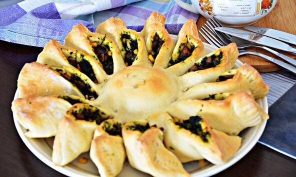 Сегодня представляем вам идею для оригинального блюда. Проста в приготовлении, превосходна на вкус! Солнечный свет пиццы, который будет сиять на вашем столе. Тесто: 1,5 чайной ложки дрожжей 1 чайная ложка сахара 1 чайная ложка соли 1 столовая ложка растительного масла 1 стакан молока 3 чашки муки Начинка: 450 гр замороженного шпината 6 столовых ложек консервированной кукурузы 4 зубчика чеснока 2 луковицы 60 гр сыра моцарелла 100 гр колбасы Соль, перец 1 яйцо Горсть семян подсолнуха 1 столовая ложка растительного масла Дополнительно: 1 яйцо для смазывания Семена подсолнуха для посыпания Выполнение: В глубокой миске смешайте дрожжи с солью и сахаром. Добавляем масло и теплое молоко, перемешиваем, засыпаем муку и замешиваем тесто. Посыпать мукой, накрыть крышкой и оставить на 30 минут, пока оно не подимется. В это время нарежьте колбасу и лук на кубики и обжарьте на горячей смазанной маслом сковороде. Затем добавьте шпинат и тушите под крышкой около 10 минут, добавьте чеснок, кукурузу,