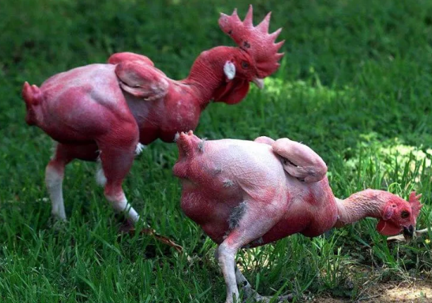 Желание улучшать природу у человека присутствует давно. Этому способствует активное развитие генетики. И вот недавно увидела свет новая порода куриц, которые практически сразу готовы к приготовлению. Трудились над созданием лысых птиц ученые в Израиле. Они скрестили крупные мясистые породы с теми, у которых было очень мало перьев. И затем, отбирая и скрещивая самых «лысых» созданий, получили в итоге таких кур, которые появляются на свет без перьев. Это махом решило сразу несколько проблем с выращиванием птиц. Курочки не заражаются всякими пероедами и пухоедами. С легкостью могут жить в жарком климате. А при забое их не нужно ощипывать и осмаливать. Вид у курочек очень непривычный. Зато мясо нежное и вкусное. Поэтому местные фермеры уже начали разводить у себя эту востребованную породу. Есть только неприятная новость для любителей шкурки – употреблять в пищу у этих птиц ее нельзя. Однако для худеющих и это не проблема, ведь они изначально отказываются от шкурки из-за ее повышенной