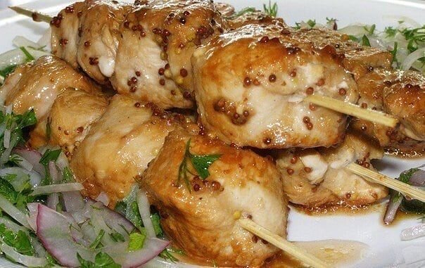 4 Шашлык должен получиться красивого золотистого цвета. Не забудьте один раз перевернуть шпажки.