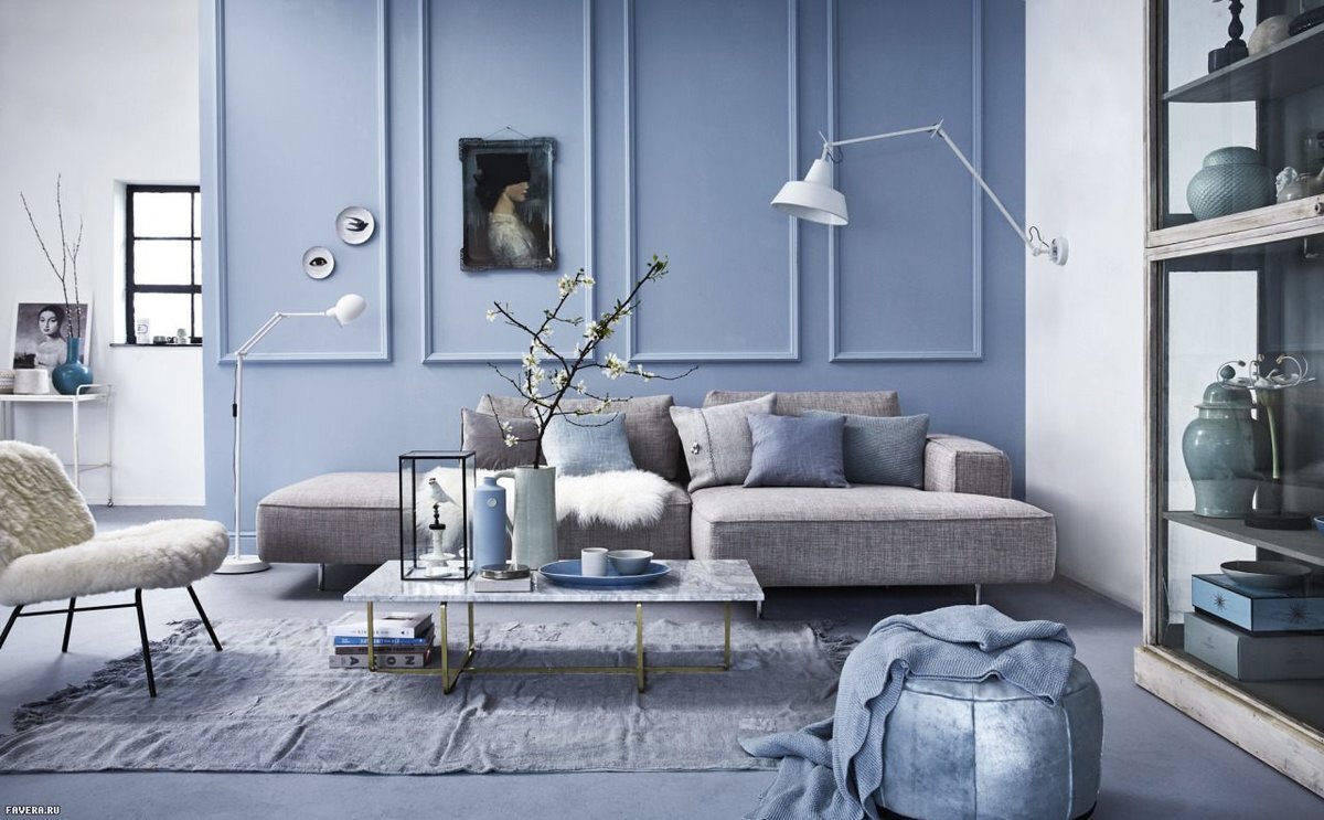 Синий цвет и его оттенки манят своей глубиной и прохладой. Тесная ассоциация с морем, небом, васильковым полем и так далее успокаивает человека находящегося в синей комнате, но обилие данного оттенка может и оттолкнуть, вызвав чувство тревоги, паники и замкнутого пространства. Поэтому хочется раскрыть один маленький секрет для любителей синего цвета в интерьере. Для оформления помещения лучше брать разбавленный синий цвет. И желательно, что бы в виде разбавителей были светлые оттенки, например, белый. Выбрав светло-голубой цвет для интерьера, мы получаем помещение как бы заполненное воздухом. Избегайте отделки голубого цвета на всех стенах. Оригинальным решением будет выкрасить стены расположенные напротив окон в более темный оттенок голубого. Так помещение приобретет глубину и перестанет вызывать ощущение тесноты и замкнутости у находящегося в нем. Еще такой прием визуально усилит роль источников дневного света, комната будет эффектно освещена и присущий синим оттенкам холод смяг