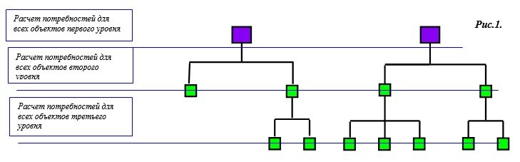 3. MRP не может решить вопрос о изменении сроков выпуска конкретного головного изделия при возникновении проблем с каким-либо комплектующим нижнего уровня, т.к. ничего не знает о корневом источнике потребности. Недостаток этот заложен в самом алгоритме расчета. MRP рассчитывает потребности сверху вниз, уровень за уровнем для всех изделий базы данных (см. рис. 1). В силу этого, корректно определить источник потребности в большинстве случаев не представляется возможным.