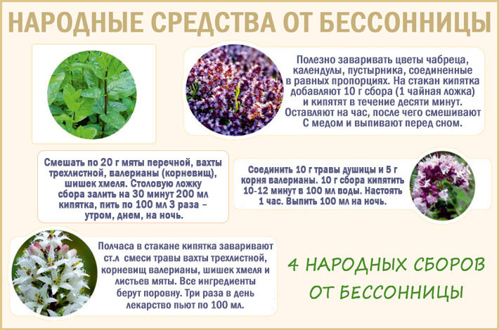 Снотворным действием обладают корни девясила высокого, семена мака, душица и мята, корни валерианы, зверобой продырявленный, корни спаржи лекарственной и цикория, почки черного тополя - спиртовая настойка, череда трехраздельная, боярышник. Помогут заснуть дыня и отвар корней аира.