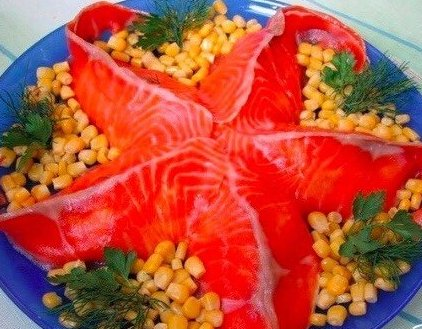 10. Поверх выкладываем полоски из красной рыбы, формируем морскую звезду.