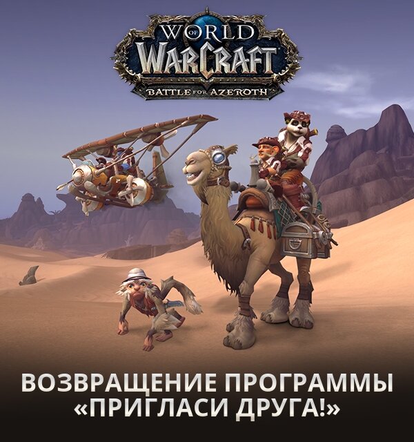 Новая, улучшенная программа «Пригласи друга» снова в игре! Зовите друзей, чтобы вместе путешествовать по Азероту, и получайте множество новых наград. Прикрепите до 10 учетных записей друзей — новичков или опытных. Прикрепите до 10 учетных записей друзей — новичков или опытных игроков, не добавлявших игровое время на учетную запись в течение двух лет — и получите игровое время и другие уникальные награды*, в том числе питомцев, средства передвижения и так далее. Чем дольше будут играть ваши друзья, тем больше наград вам будет начислено. В начале совместного приключения вы получите любопытного нового питомца Рикки — он появится в вашей коллекции, как только один из ваших друзей приобретет один месяц игрового времени.