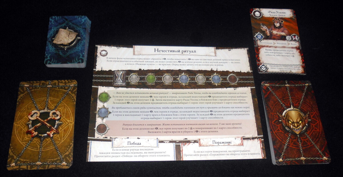 И сразу, чтобы подтвердить необходимость разведчика в команде, целительница Ашриан, решившая докинуть недостающих жетонов для исследования Сожжённой деревни, достаёт из колоды пакостную "Задержку". Но, благо, жетонов всё равно хватает для того чтобы пройти в следующую локацию.