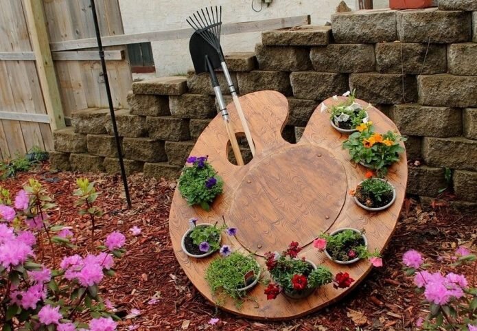 Есть дома пару лишних квадратов фанеры или доски, но Вы не знаете куда это приспособить? Полы застелены, а стены обиты? Не спешите дарить соседу по дачному участку, лучше смастерить из них декорации, которые станут предметом гордости для Вас, и восхищения — для гостей. Вашему внимаю подборка прекрасных примеров, которые будет не сложно повторить самостоятельно! Клумба-подставка Идея сочетает в себе сразу два решения: декор и практическое применение. Изделие не только украсит Ваш участок, но и позволит складывать дачный инвентарь. Выглядит аккуратно, практично, а самое главное — оригинально. Правда потребуется 2 довольно больших 4-миллиметровых листа фанера, склеенных друг с другом, несколько цветочных горшков и лобзик для пропила отверстий. Цветник Для оригинального цветника Вам потребуются 4 листа фанеры, краска и немного фантазии. Фигурка должна быть красивой и поднимать настроение. Ведь именно для этого мы и выбираемся на дачу — отдохнуть от рутины и городской серости. Какое животно