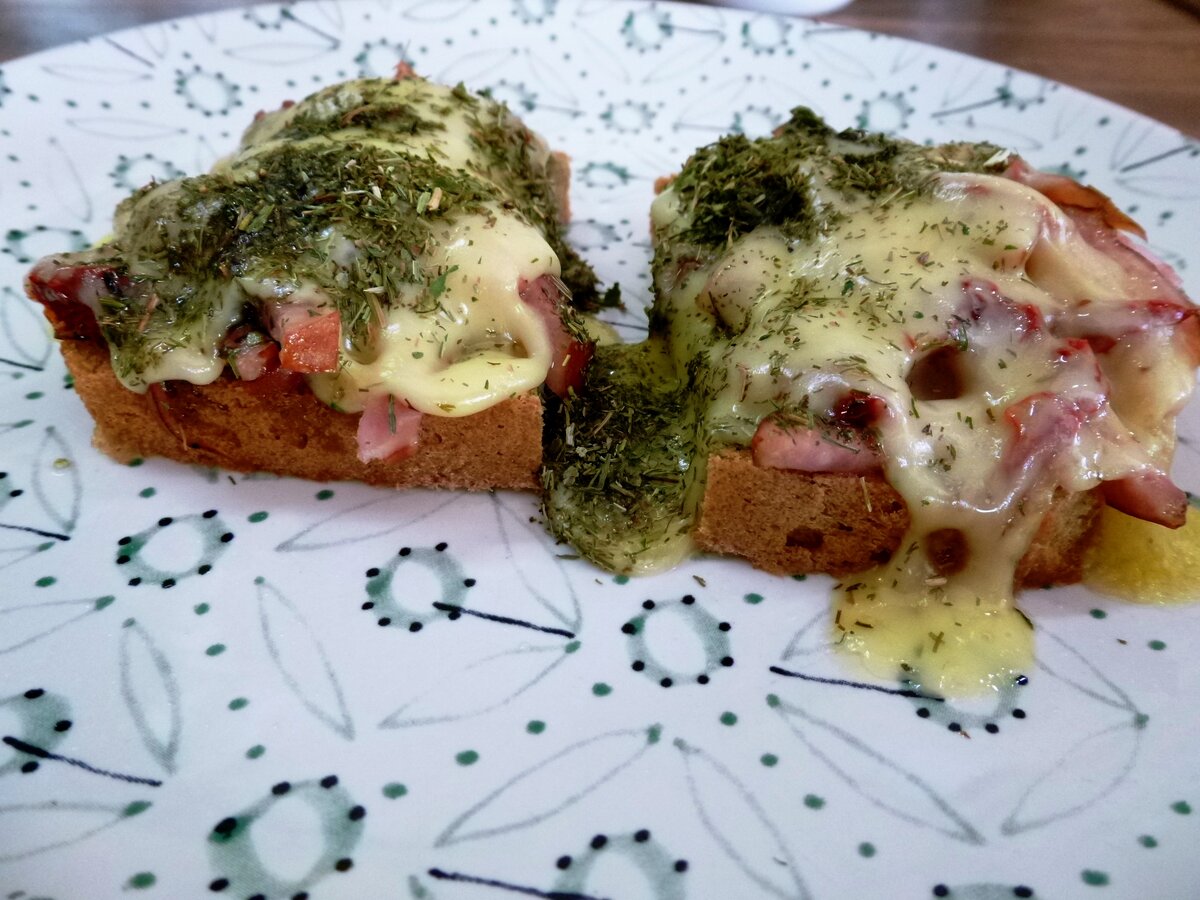 Такие горячие бутерброды это и идеальный завтрак, и если угодно – полдник, даже ужин, когда после работы нужно что-то быстро закинуть в «топку» и заняться кучей дел. Две-три минуты «возни» и вот на столе уже маленькие, обжигающие рот растаявшим сыром, практически настоящие пиццы. Берём: Хлеб – 1 срез Колбаса копчёная – 100 гр. Помидоры вяленые – 6-8 долек (или 2 свежих «черри») Сыр мягкий – 100-120 гр. Укроп сушёный – 1/2 ч. л. Петрушка сушёная – ½ ч. л. Розмарин сушёный – 1/3 ч. л. Чёрный свежемолотый перец – 1/2 ч. л. Соль - щепотка Маслины без косточек – 4 шт. Отрезаем у хлеба коричневую верхушку (иначе она будет горчить), делаем односторонний тост на сухой сковороде без масла (или обычный тост в тостере) и разрезаем его поперёк пополам. Колбасу очищаем от оболочки, нарезаем соломкой и выкладываем на половинки тоста. Режем помидоры (не мелко!), распределяем их по колбасе, чуть солим и сдабриваем свежемолотым чёрным перцем. Маслины режем кольцами и выкладываем на помидоры. Накры