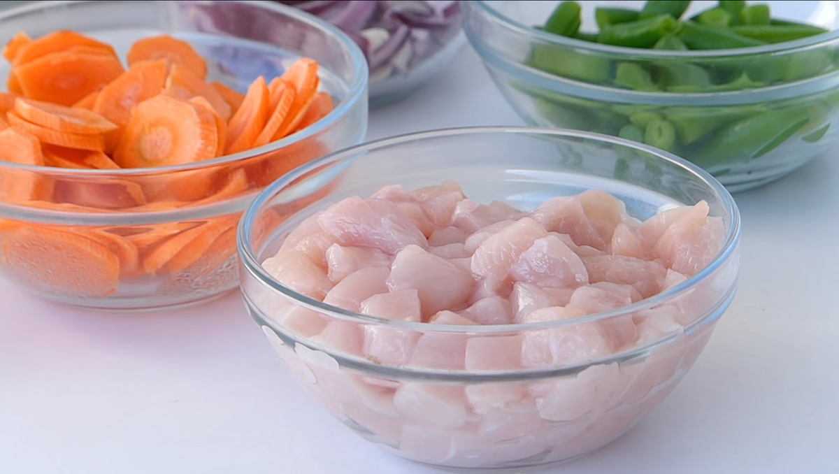 Готовится быстро, вкусно и питательно! В кастрюлю с толстым дном наливаю растительное масло, опускаю измельченные чеснок, имбирь, мелко нарезанный лук и все обжарить помешивая. Добавляю курицу, нарезанную мелкими кубиками и продолжаю обжаривать. Не забываю щепотку соли и четверть чайной ложки перца черного. Высыпаю морковь, нарезанную кольцами и горошек с фасолью, тушу 5-10 минут. Теперь наливаю 1 литр воды и довожу до кипения. Сюда же добавляю смесь сушеных приправ по вкусу. Когда вода закипит, опускаю тонкую лапшу, снова довожу до кипения и кладу в бульон кетчуп, размешиваю. И снова довожу до кипения, через 5-7 минут наш суп готов и можно подавать к столу. Приятного аппетита!