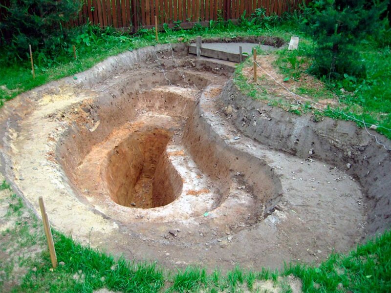 Мечта многих дачников – иметь собственный водоем на участке. Расскажу, как я сделал пруд на даче практически бесплатно. Определили место и размер, пруд решили сделать диаметром 4 метра, глубиной 1,5 метра. Выкопал за два дня, сделав 2 ступеньки. Ступеньки ничем не укреплял, за прошедшие 3 года берега не обвалились. Фотографий как копал нет, но было что-то вроде такого: На дно пруда вместо геотекстиля застелил ст арый линолеум, оставшийся после ремонта в квартире. Через приятеля удалось найти списанный тент от фуры (списанный тент достался за бутылку коньяка). Размер тента 6 на 12 метров, сложил его пополам, по размеру подошел отлично. Так же повезло, что тент оказался в хорошем состоянии, без дыр, не пришлось его клеить. Края тента по берегу засыпал землей и уложил камнями. За камнями специально ездил на свежевскопанное поле. Залил пруд водой из колодца. Спереди сделал заборчик. Дальше в течение 3 лет потихоньку его декорировал. В заде сделал площадку с лавочкой: Сделал декорати