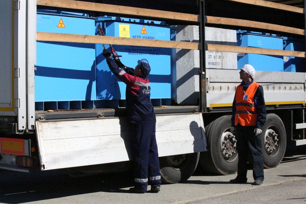 «НО РАО» не занимается транспортировкой отходов от предприятия до своего хранилища — это делает специальная транспортная организация. Грузовик к с контейнерами заезжает на территорию хранилища, где его встречают сотрудники ФГУП «РосРАО». Они тщательно замеряют фон вокруг него, чтобы убедиться, что герметичность не нарушена и с грузом можно работать.