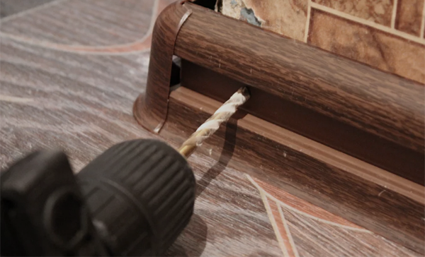 1. приложите плинтус с внутренним уголком к стене и шилом сделайте отверстие в кабель-канале;