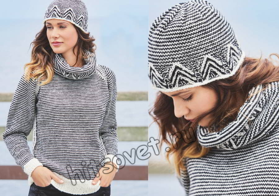 Вязание спицами модного женского комплекта, состоящего из пуловера снуда и шапочки со схемой и пошаговым бесплатным описанием.
