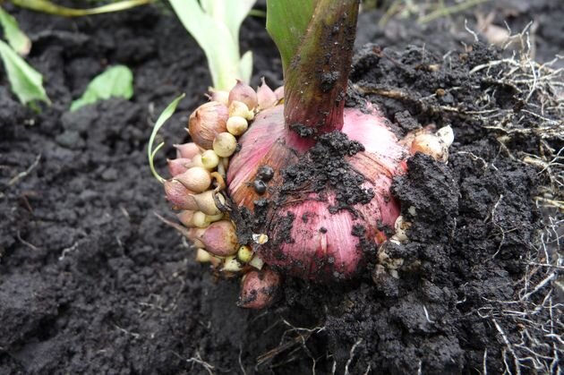 После выкопки листья обрезают, оставив "пенек" высотой 5–10 см. Затем материал тщательно просушивают под навесом, а через неделю отбирают детку, удаляют старую клубнелуковицу и укорачивают надземную часть до 2–3 см. После этого сушку продолжают еще 3–4 недели в ящиках в хорошо отапливаемой комнате при +25–30 градусов.
