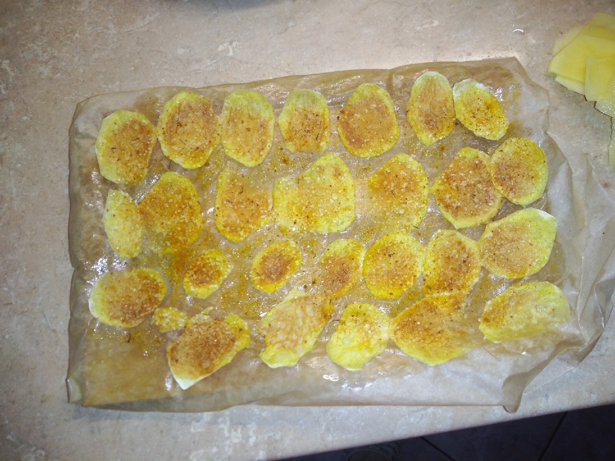 Чипсы - это не самый полезный продукт, а также вариант, как можно пару картошин продавать по цене 2 килограммов. Но домашние чипсы - это совсем другое дело, вы точно знаете, что в составе, но и ими, конечно же, не стоит перебарщивать. Из ингредиентов нам понадобится картофель и специи. Специи - какие хотите, у меня ореховая соль. Люблю также просто соль - вообще ничего лишнего. Чистим картофель, нарезаем тоненькими полосками - я нарезала той же чистилкой. Берем лист пергамента, кладем на тарелку или какую-нибудь доску, смазываем чуть растительным маслом, выкладываем картошку и посыпаем специями. Кладем это в микроволновку, в моей микроволновке мощность не регулируется, какая там по умолчанию стоит - наверное, самая большая, ставим таймер минуты на 3. Посматриваем на наши чипсы - когда они станут румяными - вытаскиваем, иначе они сгорят. Они очень хрустящие, вкусные, единственная сложность в этом рецепте - это следить за микроволновкой. Приятного аппетита!