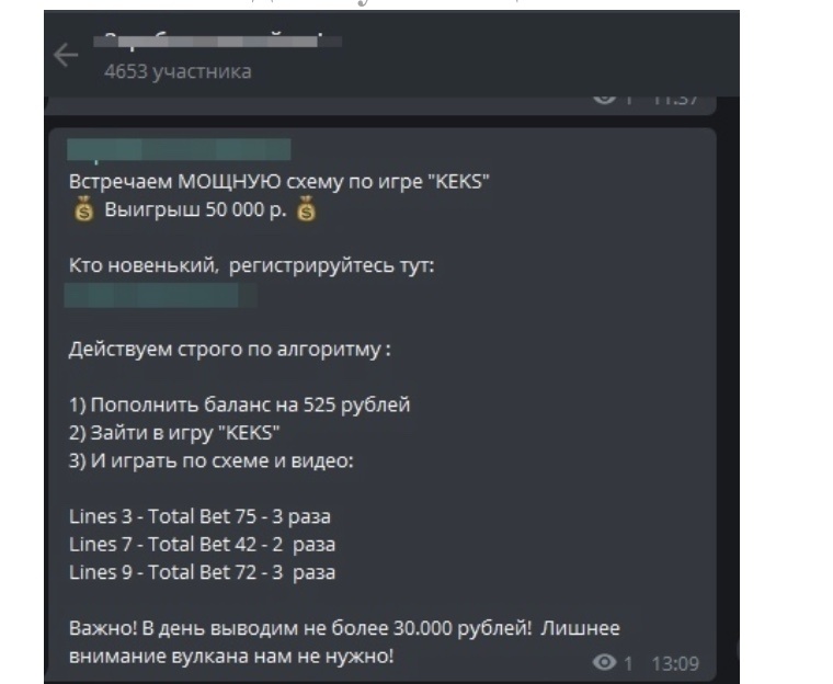 больше примеров, наберите в поиске Telegram ключевые слова: «вулкан … , схемы … , казино …», — и вы увидите массу примеров подобных каналов.