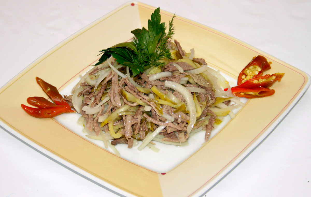 Что можно сказать про салат, который когда то сама придумала, сто раз готовила, сто раз нравился. А как он может не понравится, тут же все продукты самые подходящие друг другу. И ничего лишнего, и все в меру. Вы можете посмотреть на видео как я готовила, сразу извиняюсь за звук, рядом работал холодильник и гудел как скаженный.. Спасибо за просмотр! Подписывайтесь на нашу рассылку, здесь всегда найдете себе свой особый рецепт по душе. Все что нам потребуется: 300 г отварной говядины (нежирной) 150 г лука 150 г маринованных огурчиков 100 мл растительного масла 1-2 зубчика чеснока Лавровый лист, черный перец 1 Мясо разобрать на волокна 2 Огурцы нарезать соломкой. 3 Лук нашинковать полукольцами.Подготовленные ингредиенты переложить в глубокую посуду слоями. 4 Масло раскалить в сковороде, добавить чеснок, лавровый лист и перец 5 ..а затем влить через сито в салат. Перемешать. Салат выдержать в холоде 12 часов, а затем подать, украсив зеленью. Вкусный и сытный, к тому же простой салат го
