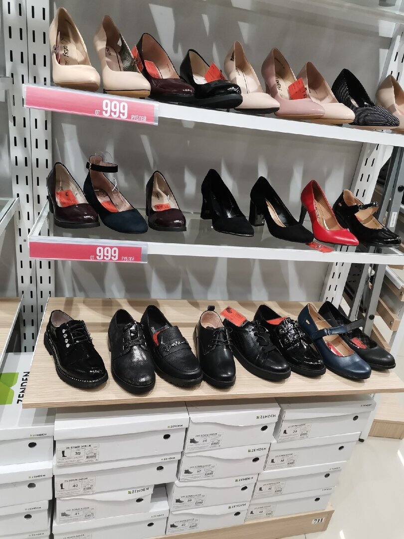 Замечаю в последнее время, как между обувными магазинами растет конкуренция - у нас в торговом центре, где я бываю чаще всего, за последние полгода поменялось около 5 подобных магазинов (открываются новые, но, видимо, не удается им тягаться с более популярными сетевиками), неизменными остаются только "Kari" и "Zenden" (если выбирать из тех, у которых цены приемлемые для многих). И вот именно о втором магазине я бы хотела рассказать, поскольку нашла большое количество выгодных, по мнению магазина, предложений. Сама лично я ко многим скидкам отнеслась довольно скептически, потому как либо обувь совсем не понравилась (думаю, что без скидок ее бы просто не купили), либо изначально стоимость была явно через чур высокой. Для меня пока не совсем понятно, почему в "Зендене" всегда так много красных ценников и акций, но, видимо, никаких убытков это не приносит, раз нам почти регулярно предлагают обувь со скидками до 70%. Вот так выглядит полочка с обувью: Не сложно заметить, что каждая пара пол
