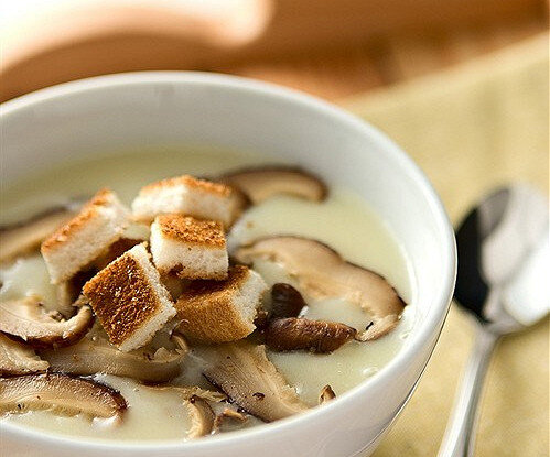 ИНГРЕДИЕНТЫ Оливковое масло 2 столовые ложки Лук репчатый 1 головка Шампиньоны 450 г Молоко 300 мл Белый хлеб 8 кусков Овощной бульон 850 мл Чеснок 2 зубчика Сливочное масло 50 г Швейцарский сыр 75 г Сушеные белые грибы 30 г ИНСТРУКЦИЯ ПРИГОТОВЛЕНИЯ 1. Разогреть масло в кастрюле, обжарить луковицу 3–4 минуты до золотистого цвета. 2. Подготовить грибы и нарезать на небольшие кусочки. Добавить в кастрюлю, помешивая, чтобы они все были покрыты маслом. 3. Влить молоко, довести до кипения, накрыть и тушить 5 минут. Постепенно добавить горячий овощной бульон и приправить солью и перцем по вкусу. Готовую смесь измельчить в блендере. 4. На гриле подсушить с обеих сторон кусочки хлеба. Смешать чеснок и масло и намазать им тосты. Сушеные грибы залить горячей водой на 10–15 минут.