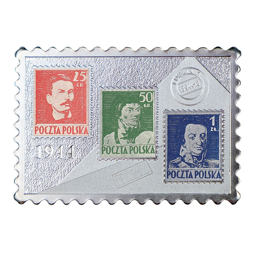 Монетный двор Польши презентовал продолжение серии «История польских марок». На монете изображены сразу 3 марки под названием «Вожди», представленные 7 сентября 1944 года. Оригиналы марок представляют настоящую редкость на рынке коллекционеров. Марки с изображениями Ромуальда Траугутта, Тадеуша Костюшко и Генрика Домбровского достигают рекордных цен. Номинал монеты – 1 новозеландский доллар, изготовлены из серебра 999-й пробы, тираж - 499 штук. Качество изготовления – «пруф». При чеканке использована цифровая печать. Форма монеты напоминает почтовую марку с перфорированными краями. Это уже 4 монета в серии. Предыдущие монеты были посвящены памятным маркам 1928, 1919 и 1860 годов На аверсе слева расположено стилизованное изображение почтовой марки с нанесенным на ней контуром территории Второй Польской Республики. Также показан почтовый фургон 1920-х годов и почтовый рог. Справа находится портрет Ее Величества Елизаветы II. На сайте монетного двора Польши эту квадратную монету можно
