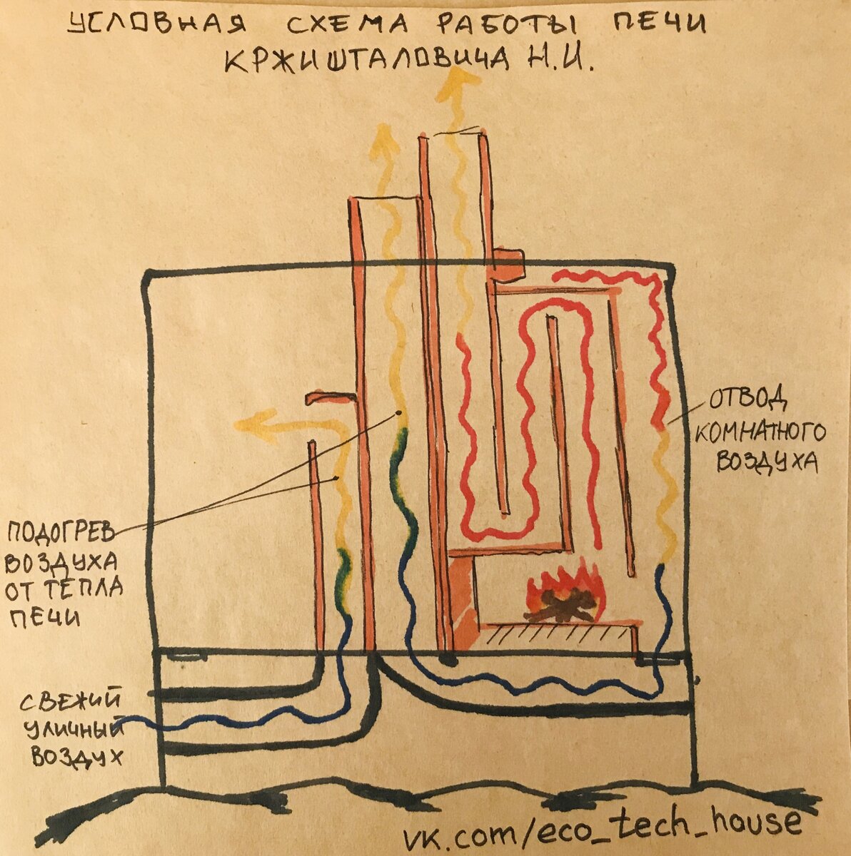 Печи непревзойденного печного мастера Кржишталовича Н.И. Николай Иванович Кржишталович создал до революции наиболее успешную школу печников. Печи Кржишталовича были так удачны и безопасны, что страховщики снижали ставки на обязательное страхование на случай пожара. Кроме печей Кржишталович занимался обеспечением в домах здоровой атмосферы способствующей долголетию, обязательно устраивая искусственную (а не естественную!) вентиляцию даже в крестьянских избах. В печах Кржишталовича много внимания отведено внимания практическому применению и вентиляции помещений. Особенности печей Кржишталовича: 1. Печи Кржишталовича неотделимы от вентиляции. 2. Воздух для дыхания может подаваться только снаружи. Свежий воздух не сообщается с подпольем и канал его поступления под полом должен быть утеплен или выложен кирпичом, иметь заслонку и сетку от птиц, грызунов и т.п. Проход уличного воздуха делается под полом с улицы вдали от выгребных ям по каналу, сложенному из кирпича по глине или на цем