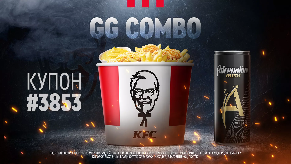 Купон # 3853 ПРЕДЛОЖЕНИЕ НА КУПОН “GG COMBO” (#3853) ДЕЙСТВУЕТ С 14.10 ПО 8.12 ВО ВСЕХ РЕСТОРАНАХ KFC, КРОМЕ АЭРОПОРТОВ, ПГТ ШАХОВСКАЯ, ГОРОДОВ КУБИНКА, КИРОВСК, ЛУХОВИЦЫ, ВЛАДИВОСТОК, ХАБАРОВСК, НАХОДКА, БЛАГОВЕЩЕНСК, ЯКУТСК.