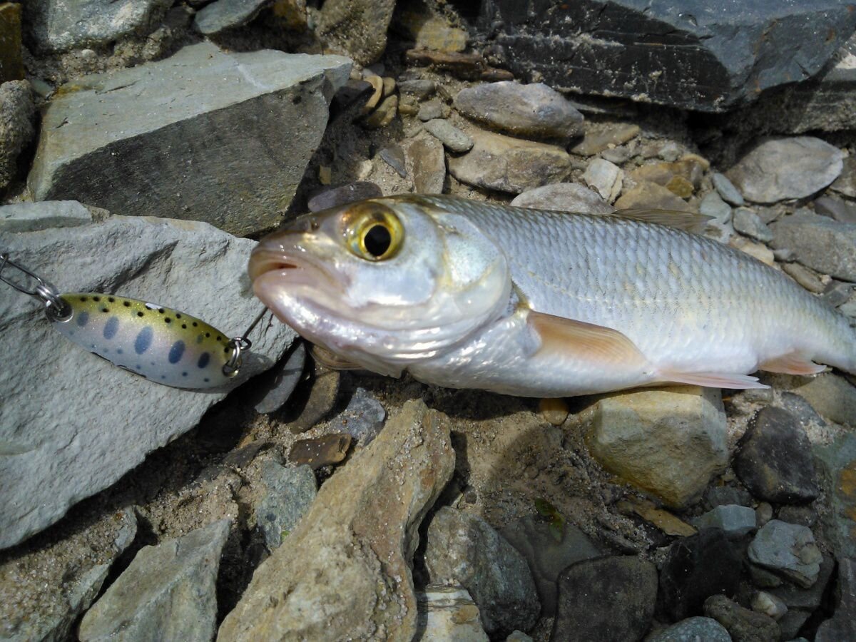 Перекат "молчал". Не было даже намёков, что елец кормится или вообще здесь обитает) Ловлю начал с колебалки Смитт Пьюр 2 гр "под форельку". И вот на 25-30 забросе ОН клюнул! Поклёвка совсем не похожа на окуня или щучку. Тем более, что взял елец с самой что ни на есть струи!) Я сразу же вспомнил прошлогоднюю ловлю))) И вот на берегу трепещется серебристый красавец) Ну, почти как голавль!)))))))) Так и продолжил я ловить Пюрешкой, то и дело доставая из реки ельчиков.