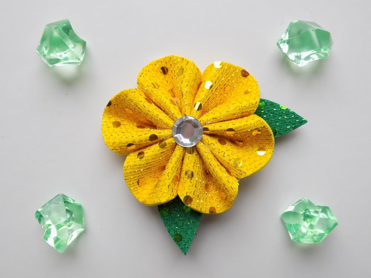 Современные материалы для творчества позволяют изготавливать самые различные поделки. Имея фоамиран двух цветов, можно выполнить цветок, показанный в данном мастер-классе. Для создания желтого цветочка мы взяли: Для создания лепестков будущего цветочка потребуется вырезать из желтого фоамирана 3 круга одинакового размера. Рисуем их с обратной стороны фоамирана зубочисткой, обводя круглый предмет. После этого вырезаем ножницами. Но непосредственными заготовками для лепестков будут половинки кругов, поэтому каждый круг разрезаем пополам. В итоге получили 6 заготовок в виде полукруга. Далее нам потребуется клеевой пистолет. Наносим каплю горячего клея на середину основания полукруглой заготовки, после чего складываем ее пополам. Затем каждую из сторон требуется отогнуть и зафиксировать. Для этого горячий клей наносим на край заготовки, а затем прижимаем одну из сторон. После этого аналогичным образом закрепляем вторую сторону. Такой первый лепесток у нас получился. Для цветка делаем 6 так