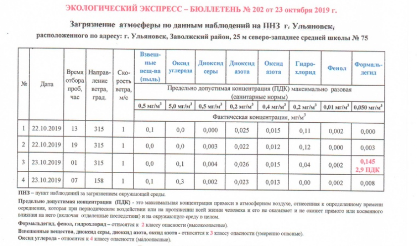 Вчера управление по гидрометеорологии и мониторингу окружающей среды Ульяновской области опубликовало очередной экологический эксресс-бюллетень о состоянии атмосферного воздуха. Анализ проводился на основе данных пункта наблюдений за загрязнением окружающей среды, который расположен в Новом Городе, рядом со средней общеобразовательной школой №75. Согласно опубликованному отчету 23 октября превышение предельно-допустимых норм по формальдегиду составило 2,9 ПДК. Т.е. почти в 3 раза больше нормы!!! Напомню, что формальдегид является очень вредным веществом, относящимся к 2-ому классу опасности (высокоопасные вещества). Такие превышения происходят практически ежедневно, но проблема не решается, а только усугубляется. Для её решения нужно применять комплексный подход Сегодня я расскажу об одном из самых доступных и простых методов для Ульяновска. А именно: Создание мобильной группы мониторинга окружающей среды. Дело в том, что сейчас жителям Ульяновска фактически некуда пожаловаться н
