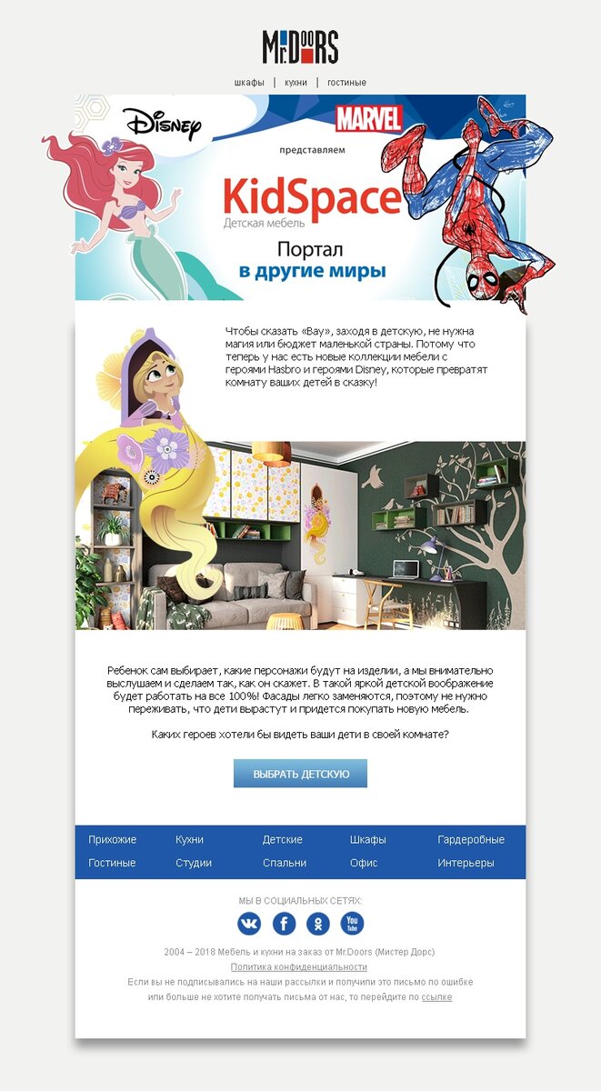 А еще компания тщательно использует хитрости копирайтинга, описывая выгоду от покупки в основном контенте письма: “Чтобы сказать “Вау”, заходя в детскую, не нужна магия или бюджет маленькой страны” или “Каких героев хотели бы видеть ваши дети в своей комнате?”.