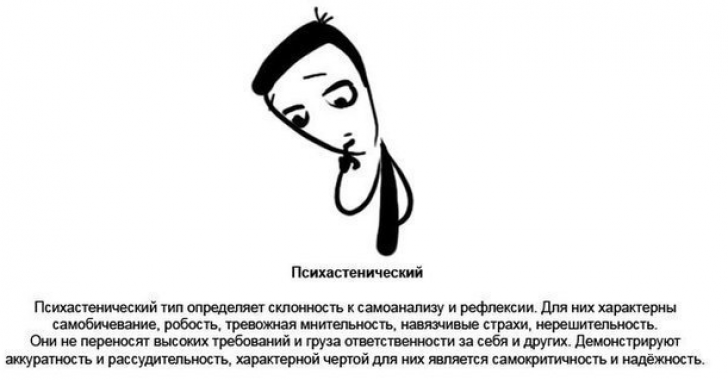 Как и астеник, психастеник наполнен постоянным конфликтом ранимого самолюбия с чувством неполноценности. Вообще психастеник по своей добросовестности, мягкости, обостренной нравственности, застенчивости, вегетативной неустойчивости весьма напоминает астеника. Однако застенчивость, стеснительность, робость, нерешительность психастеника проникнуты болезненным размышлением, самоанализом. Постоянные размышления психастеника о смысле жизни построены на густых сплетениях въедливых психастенических сомнений.