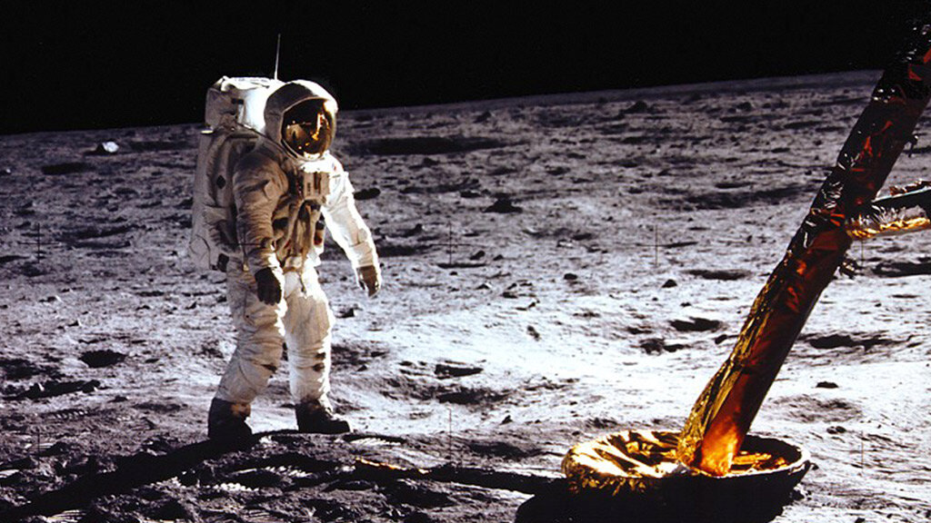 Спустившись по трапу на лунную поверхность, Баз тут же развернулся и прыгнул назад, на нижнюю ступеньку, проверяя, сможет ли вернуться. Тем временем Армстронг уже успел собрать «аварийные» образцы грунта, на случай если придется срочно стартовать с Луны. В научную программу «Аполлона-11» входила только установка пассивного сейсмографа, лазерного отражателя для измерения расстояния от Земли до Луны и примитивного счетчика фотонов в виде листа фольги на рамке. Сейсмограф быстро сломался, успев, однако, зафиксировать около двух десятков «лунотрясений». Лазерный отражатель позволил узнать, что Луна отстоит от нашей планеты на расстояние 373 787 265±4 метра. К концу первой лунной прогулки, как рассказывает в своей книге «Из пламени на Луну» американский писатель Норман Мейлер, даже журналисты, собравшиеся в пресс-центре НАСА, чувствовали себя так, будто досматривают четвертый период бейсбольной встречи, заранее зная результат. Пока Армстронг и Олдрин полтора часа бродили по Луне, журналисты стали скучать, а некоторые даже покинули зал…