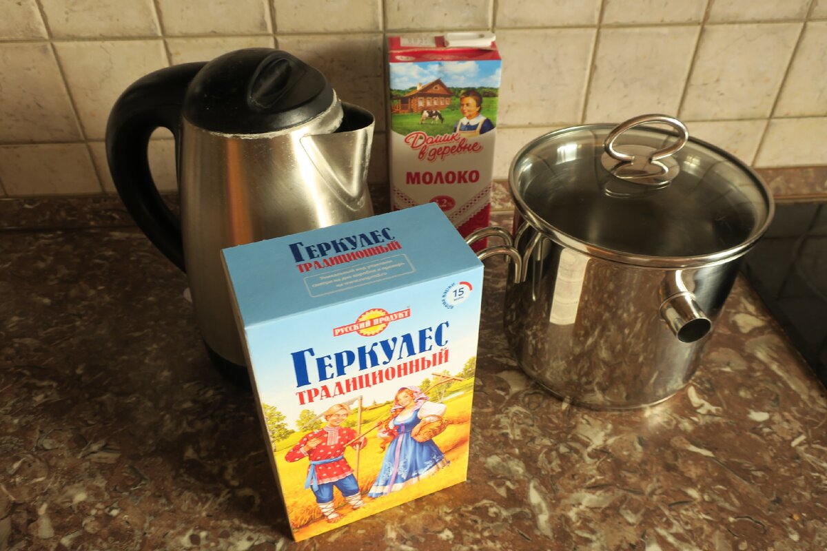 Наливаю в носик моловарки воду, кладу в кастрюлю 1 чашку геркулеса, добавляю 1,5 чашки молока и 1,5 чашки воды. Размешиваю и, пока не закипело, отлавливаю легкие чешуйки от овса. После закипания чешуйки будет сложно увидеть в общей массе.