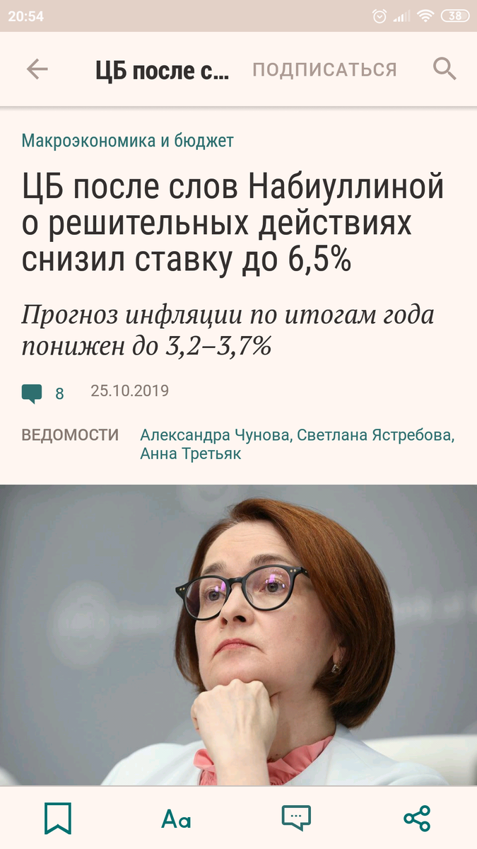 Привет, дорогие читатели! Сбылось то, о чем я писал в начале недели тут: https://zen.yandex.ru/media/id/5d7be5fb5ba2b500b75294d2/chto-jdat-po-kliuchevoi-stavke-ot-sleduiuscego-zasedaniia-cb-rf-chto-budet-s-akciiami-5dac699f0a451800ad98379e Как и предполагалось, 6,5% в данный момент то, что надо. Судя по заявлением и экспертов и банкиров после этого заседания ЦБ, все и удивлены и как-будто ожидали такого решения, хотя буквально еще вчера 70-80% всех этих аналитиков-экспертов утверждало, что снижение будет только на 0,25%. Получается, что мы с Вами предсказали гораздо точнее банковскую политику, чем люди с гордым званием "эксперт". Основная причина столько резкого снижения ставки - существенное замедление инфляции до 3,2-3,7% в годовом выражении. Как ни крути, это реально весомый успех для России, правда я не помню за свою жизнь период больше 2-3 со стабильной инфляцией. Она обязательно потом резко взлетала. Но даже здесь мы угадали, хотя уж скорее предположили, инфляцию за октябрь. О