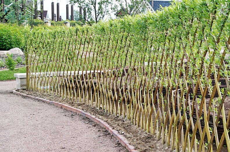 Самое интересное, что эта изгородь ЖИВАЯ! Изгородь выполняется в технике ажурного плетения из ивовых прутьев. Посадочный материал для формирования живой изгороди из ивы можно получить совершенно бесплатно, она растёт практически у любого водоёма.