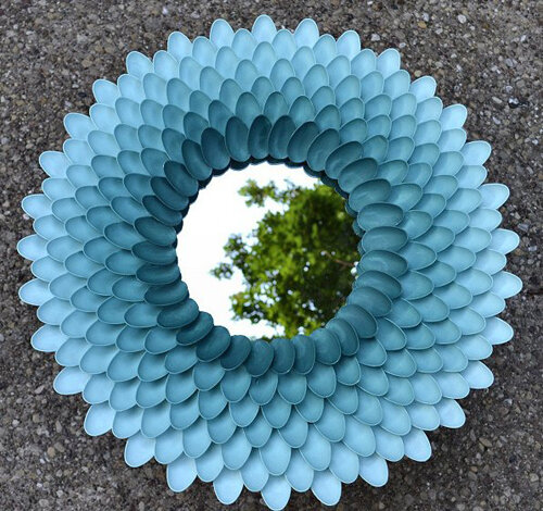 Оказывается пластиковые приборы можно применять не только по их прямому назначению, но и в качестве материала для декора разнообразных предметов интерьера. В этой статье мы поговорим о том как и что можно украшать этими пластиковыми ложками. Зеркало украшенное пластиковыми ложками. Для того чтобы сделать такое зеркало необходимо будет некое число пластиковых ложек, круглое зеркало, клеевой пистолет или другой клей, картонная подложка, краски по желанию. Для этого у ложек срезают ручки,в центр подложки приклеивают зеркало или часы, а обрезанные ложки приклеивают приклеивают их по кругу зеркала. Таким же способом можно декорировать круглые часы. Еще один способ декорирования зеркала, только здесь не нужно отрезать у ложек ручки: Декорирование подсвечника пластиковыми ложками. Для этого так же необходимо будет отрезать у ложек ручки и приклеить их к стеклянному стакану или банке, в общем к тому, во что Вы будете размещать свечку или же просто приклеить их по кругу на картонную подложку