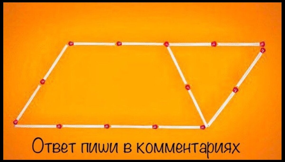 Приветствую всех! Представляю Вам новую спичечную головоломку с на логику. По примерной статистике похожих головоломок можно предположить, что такую головоломку умные решают примерно за 41 секунду. Проверьте себя, попробуйте решить не подглядывая в ответ ниже!!! Решаем по картинке выше. Сейчас там изображён 1 треугольник. Ваша задача передвинуть 4 спички так, чтобы получилось три треугольника. Ответ будет ниже, обязательно посмотрите. . . Получилось решить??? Пиши в комментарии примерное время решения и ставь палец вверх. А если Вы не нашли ответ, то советую подписаться на канал, чтобы не пропустить новые головоломки различной степени сложности! Уверен? лално смотри ответ точно??? ок ок
