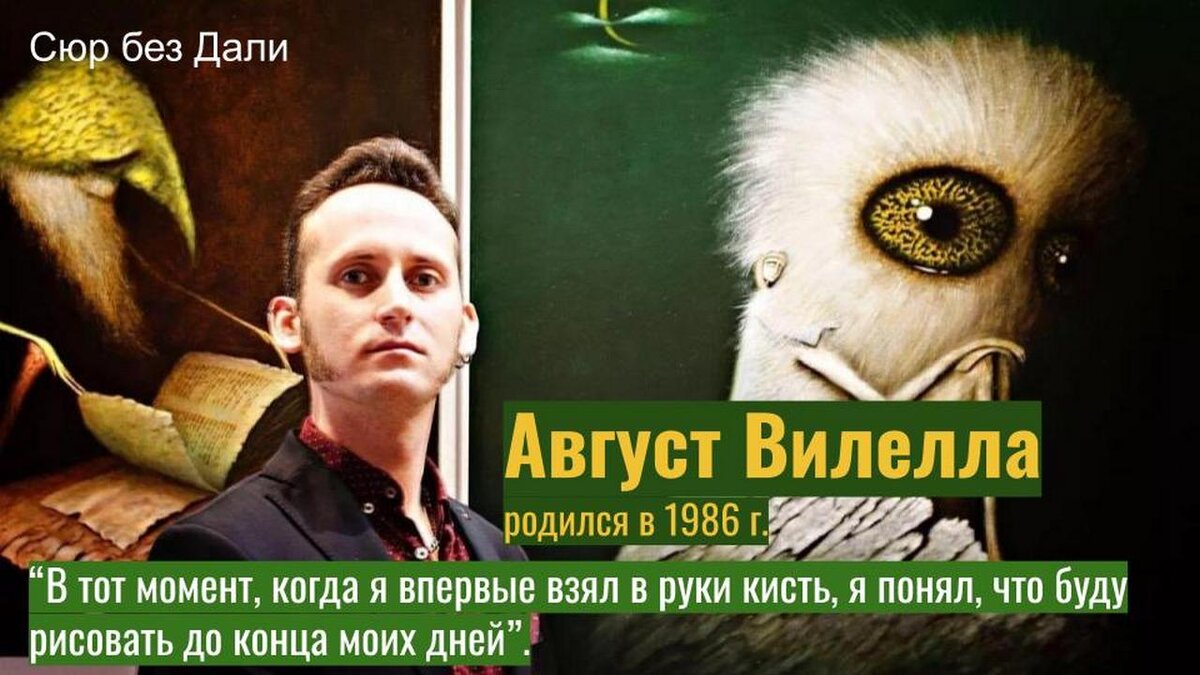 🔸 Возраст: 32 🔸 День рождения: 14 июня 1986 г. 🔸Образование: самоучка 🔸 Любимый цвет: черный 🔸 Любимые книги: «Страдания юного Вертера» (Гете), «Межзвёздный скиталец» (Джек Лондон) 🔸 Любимая цитата: «Ум без амбиций подобен птице без крыльев» (Сальвадор Дали) 🔸 Любимый фильм: «Ахиллес» и «Черепаха» (режиссер Такеши Китано) 🔸 Любимое блюдо: сашими и саке Награды 📍Лучший художник Токийской международной художественной ярмарки (Япония) 📍Лучшее инновационное искусство в Global Art Awards (Дубай) 📍Международная премия Гран-при Тайваня (Тайвань) 📍Премия председателя в Art Revolution Taipei (Тайвань) 📍Номинация на лучшего художника в Global Art Awards (Дубай) Мир искусства для Августа Вилеллы — привычная среда обитания. До того как он взял в руки кисть, он увлекался философией, музыкой, пытался стать писателем. Сегодня художник живет и создает свои шедевры в Барселоне. Отказавшись от эскизов, используя масло и применяя исключительно способ интуитивного сюрреализма, Вилелла чере