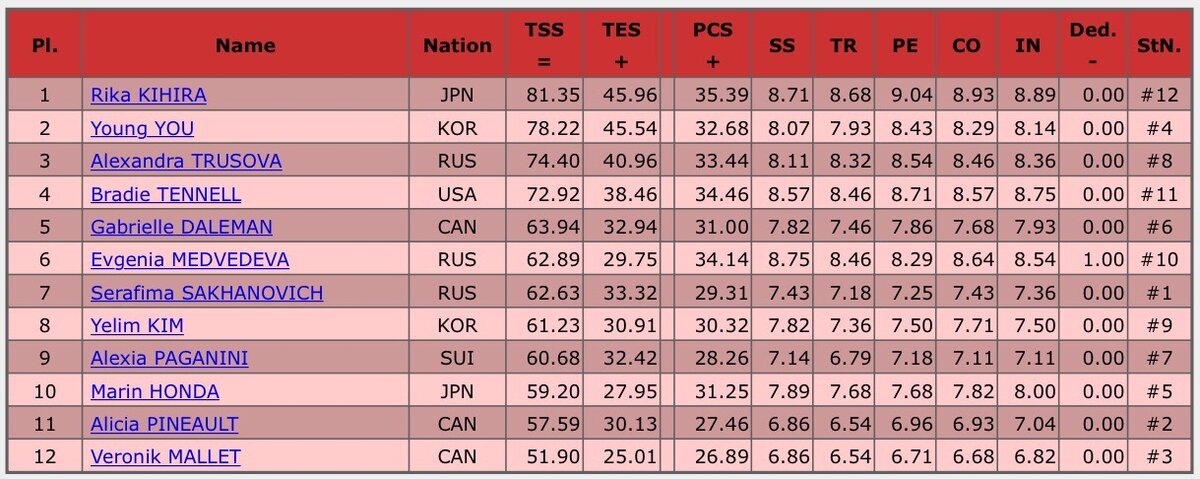 В Канаде стартовал второй этап Гран-При. Можно назвать этот этап одним из самых мощных в серии, поскольку он собрал действительно сильных спортсменок. Результат короткой программы выглядят следующим образом. Первые два места заняли представители Японии и Кореи (как в старые добрые времена). Промежуточное третье место занимает Александра Трусова. Возможно некоторые преданные болельщики могли бы расстроиться, глядя на таблицу, но не спешите. На одном из соревнований Татьяна Анатольевна Тарасова сказала: «короткая программа- это самое сложное, что есть в одиночном катании. Потому, что в произвольной можно успеть подумать, а здесь один щелчок и можно упустить элемент и нет возможности исправиться». Главная задача в короткой программе- чисто откатать свой контент. Основная же борьба ведётся в произвольной. Но стоит заметить, что «враги не дремлют». Уже большее количество девушек изучают более сложные элементы и вставляют в свои программы. Первой из Российской тройки вышла Серафима Са