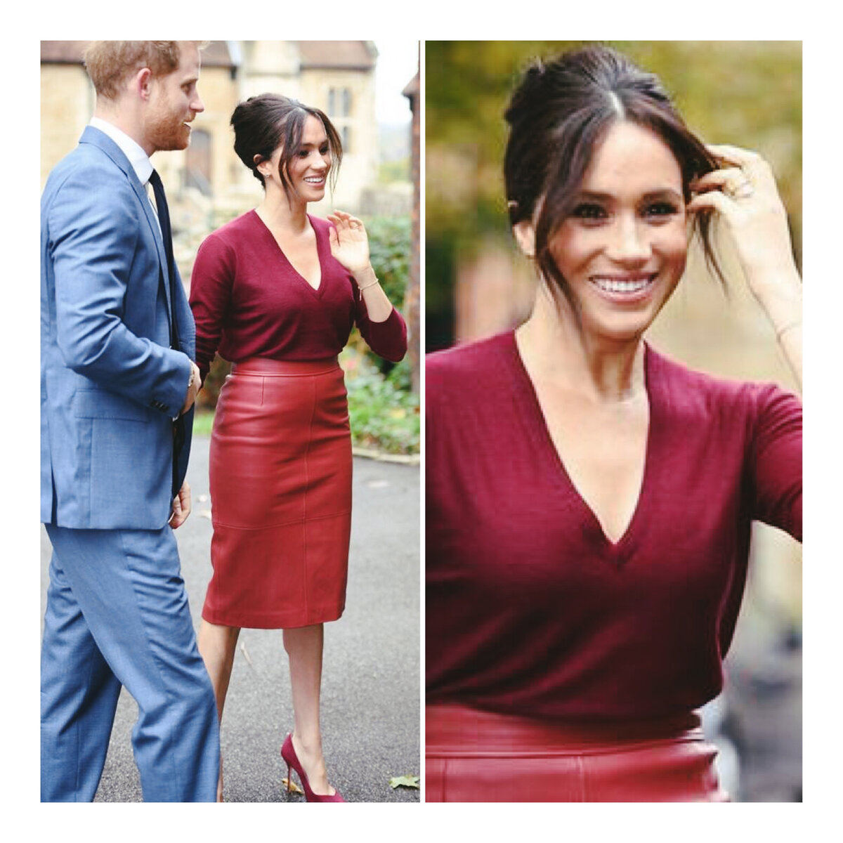 Герцогиня выглядела по-осеннему, в красной кожаной юбке-карандаш от Hugo Boss и бордового джемпера с длинными рукавами с V-образным вырезом от Joseph.