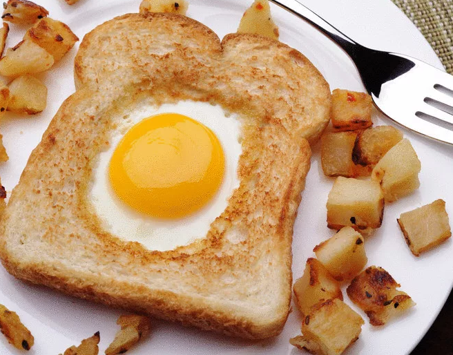 Действие 1. Приготовим ингредиенты по списку. Хлеб необязательно нужно брать свежий, подойдет и вчерашний, немного подсохший, он даже лучше подрумяниться и станет более хрустящим. Действие 2. Хлеб нарезаем на ломтики толщиной около 1,5 сантиметра. Слишком тонкие кусочки могут не удержать яйцо, и оно растекется по сковороде, испортив внешний вид блюда. Вырезаем в центре ломтика хлеба отверстие для куриного яйца. Действие 3. Это можно сделать ножом, но проще выдавить стаканом или вырубкой для печенья, если это будет фигурная формочка, то получится еще интереснее и красивее. Вырезанный мякиш не стоит выбрасывать, его также можно поджарить на сковороде. Действие 4. На сковороду наливаем растительное масло. Хорошо разогреваем масло на сильном огне. Выкладываем кусочки хлеба, обжариваем их до румяности с одной стороны. Действие 5. Затем переворачиваем и даем зарумяниться со второй стороны. Сразу вбиваем куриное яйцо, делать это нужно аккуратно, чтобы не повредить желток. Сковорода долж