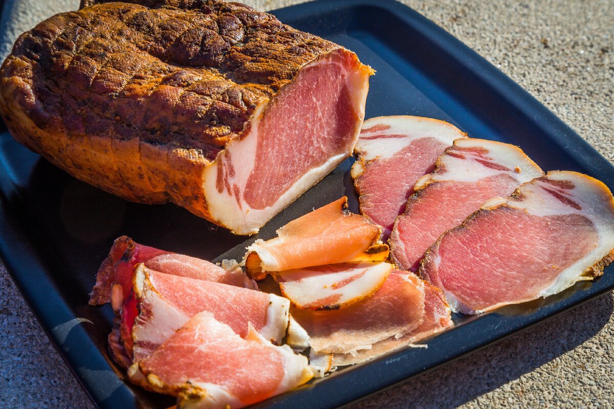 Чили, халапеньо, ореган 0.1% Обмазал этой смесью мясо и убрал в холодильник на 8 дней, регулярно переворачивая. После обмыл мясо и тщательно просушил. Перед помещением в камеру коптил пеканом, холодным способом 24 часа. Так как куски были большие сушка до потери 38% влажности заняла почти 6 месяцев. Корейка получилась отличная, ароматная и совершенно не сухая, сало пропитало мышцу жиром, а специи и копчение придали великолепный аромат.