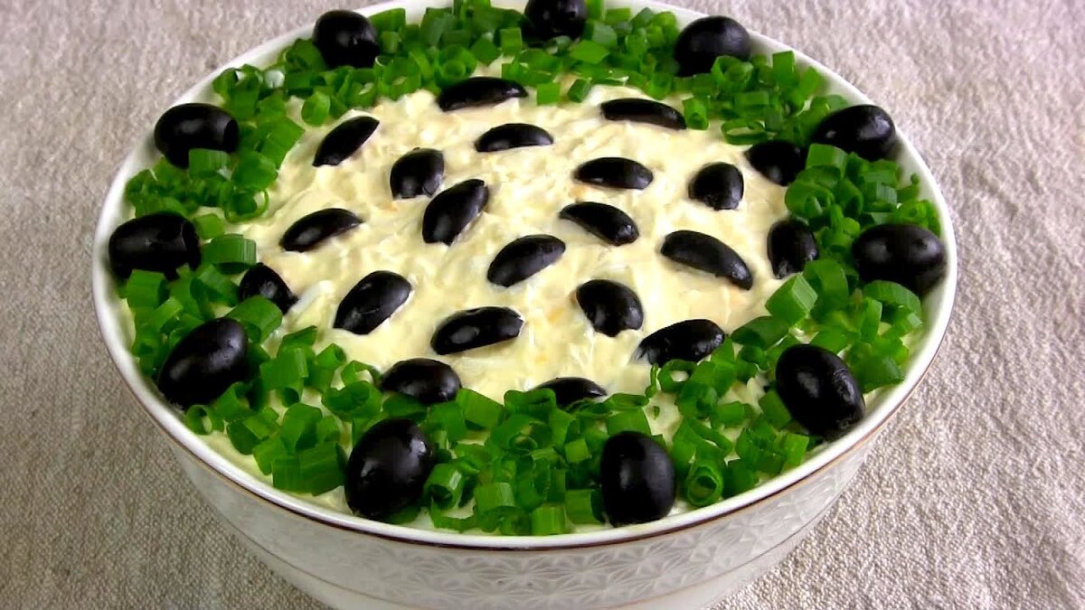 Украшением у нас будет зелень и маслины. Мелко рубим зеленый лук и выкладываем по краю салатницы, маслины же кр